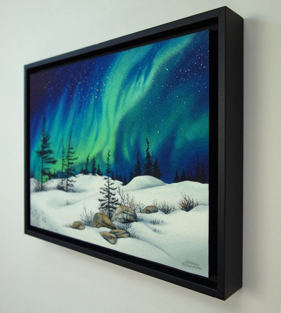 This original 9 x 12 inch (23 x 30 cm) watercolour on panel is protected with a UV-resistant coating and comes framed in a black wood frame, giving it an elegant, timeless look. Its framed size measures 10 x 13 inches (26 x 34 cm) and displays perfectly on any wall.